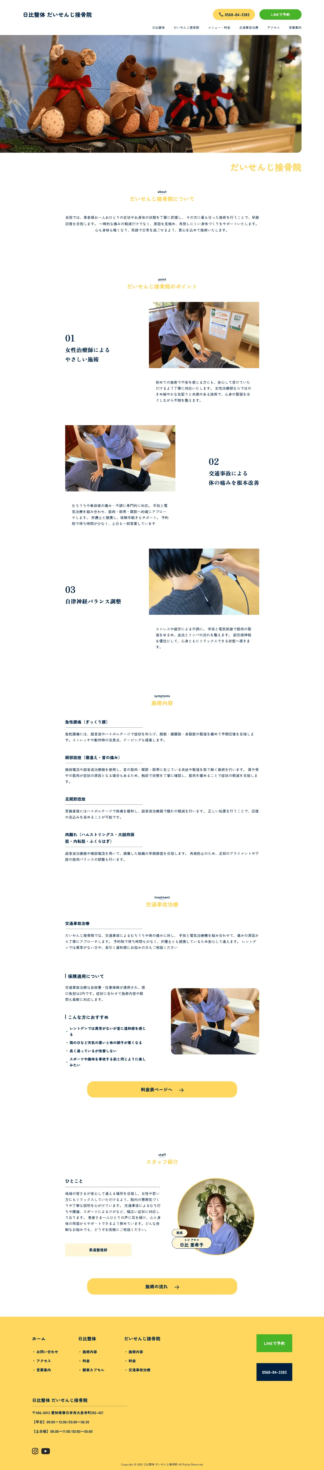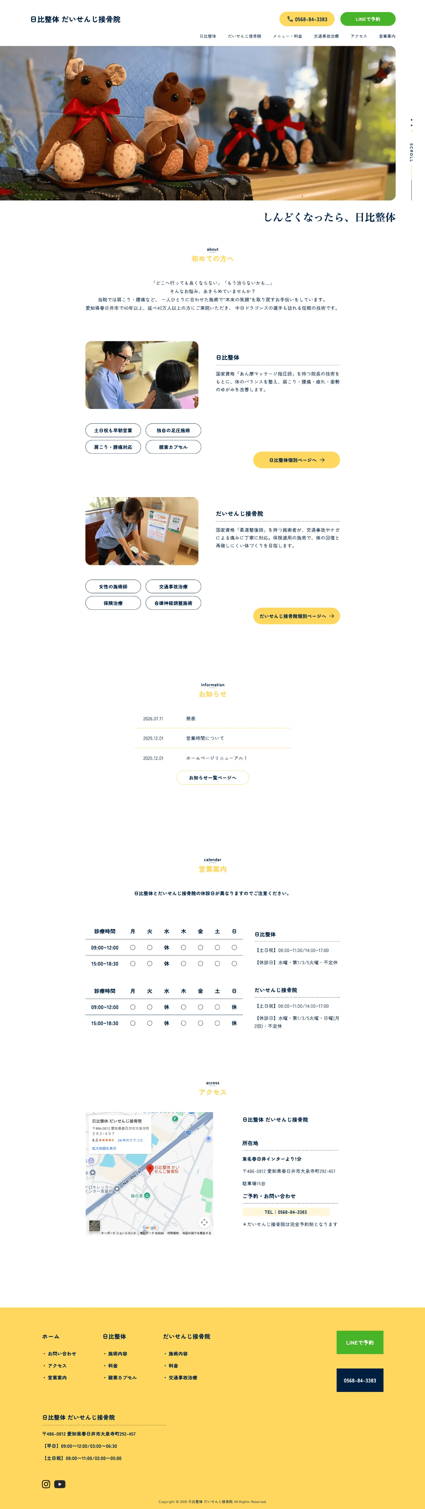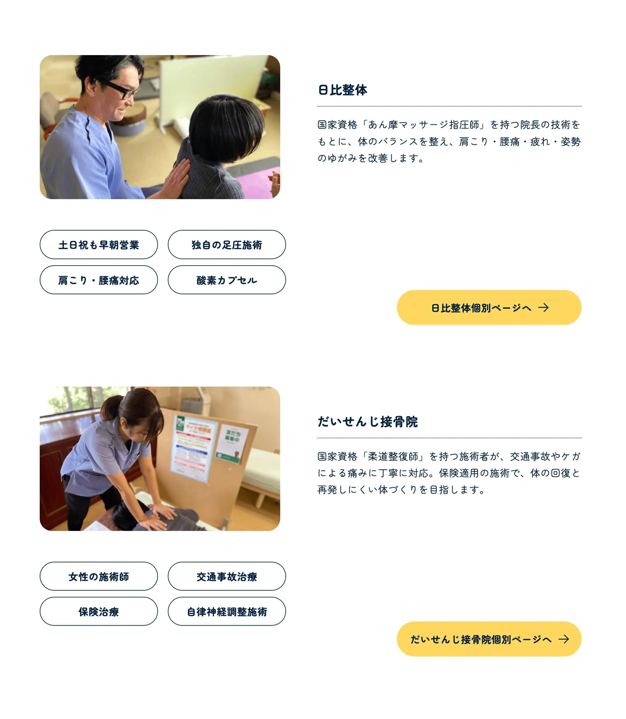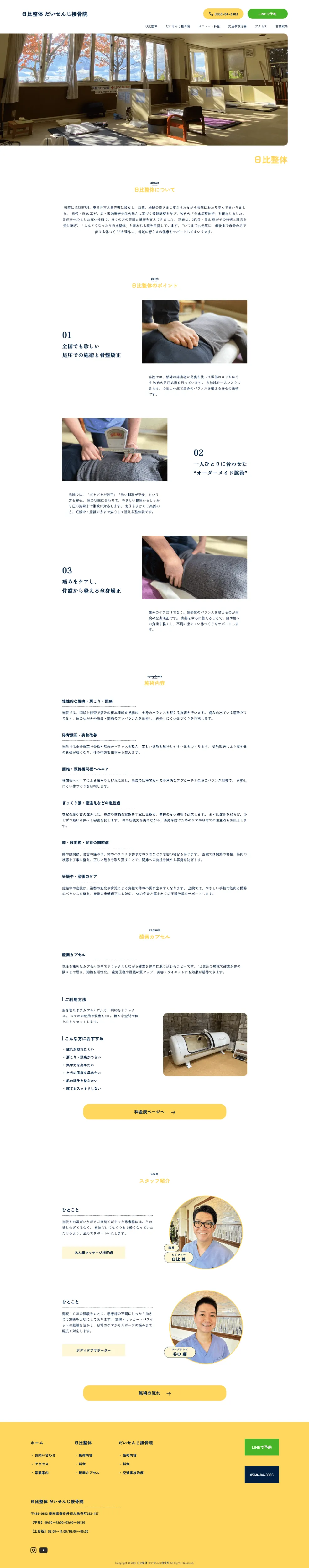 愛知県春日井市にある「日比整体 だいせんじ接骨院」様にご協力いただきサイトのリニューアルを行わせて頂きました。 整体と接骨院を併設している院の特性に合わせ、初めてサイトを訪れた方でも迷わず必要な情報にたどり着けるよう情報整理を行い、直感的に利用できるデザインを心がけました。